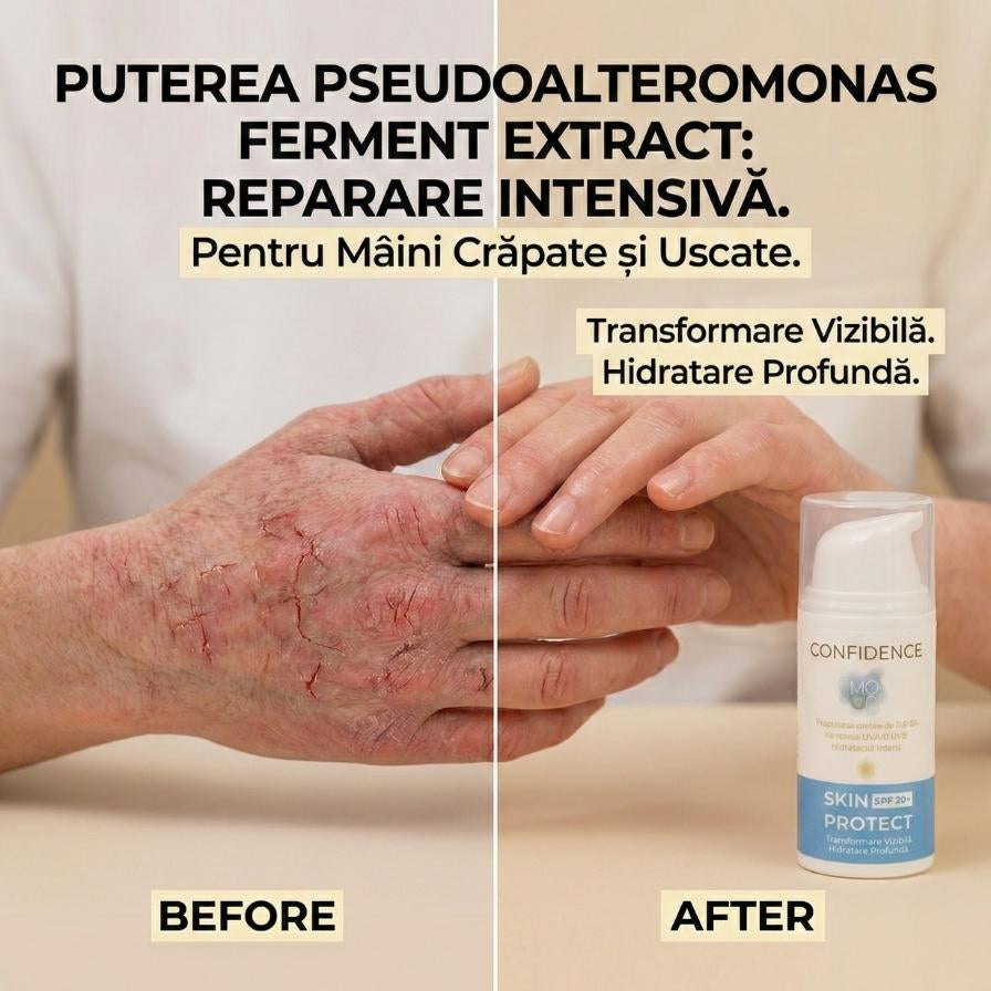 Protecția solară întâlnește biotehnologia arctică. Skin Protect nu este doar un SPF, este un scut inteligent împotriva tuturor agresorilor urbani: radiații UV, poluare și deshidratare. Secretul rezistenței sale este Pseudoalteromonas Ferment Extract, o glicoproteină rară descoperită în Antarctica, care protejează celulele împotriva condițiilor extreme și previne deshidratarea profundă.